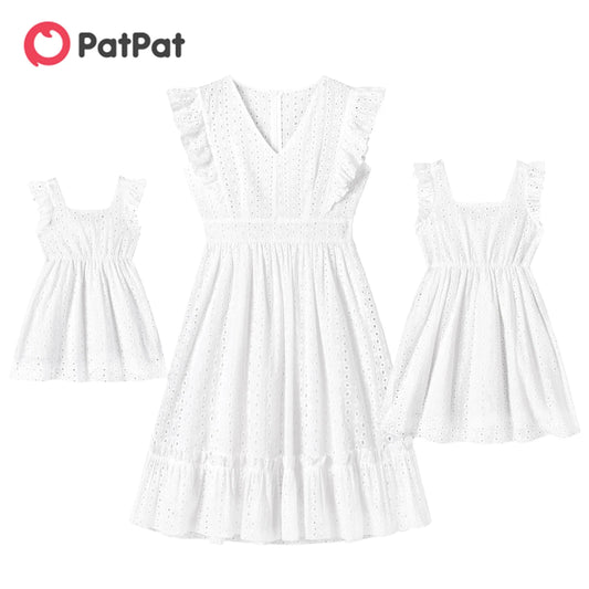PatPat 100% Cotton Family Matching Outfits White Hollow-Out Floral Embroidered Ruffle Sleeveless Dress for Mom and Me Dresses